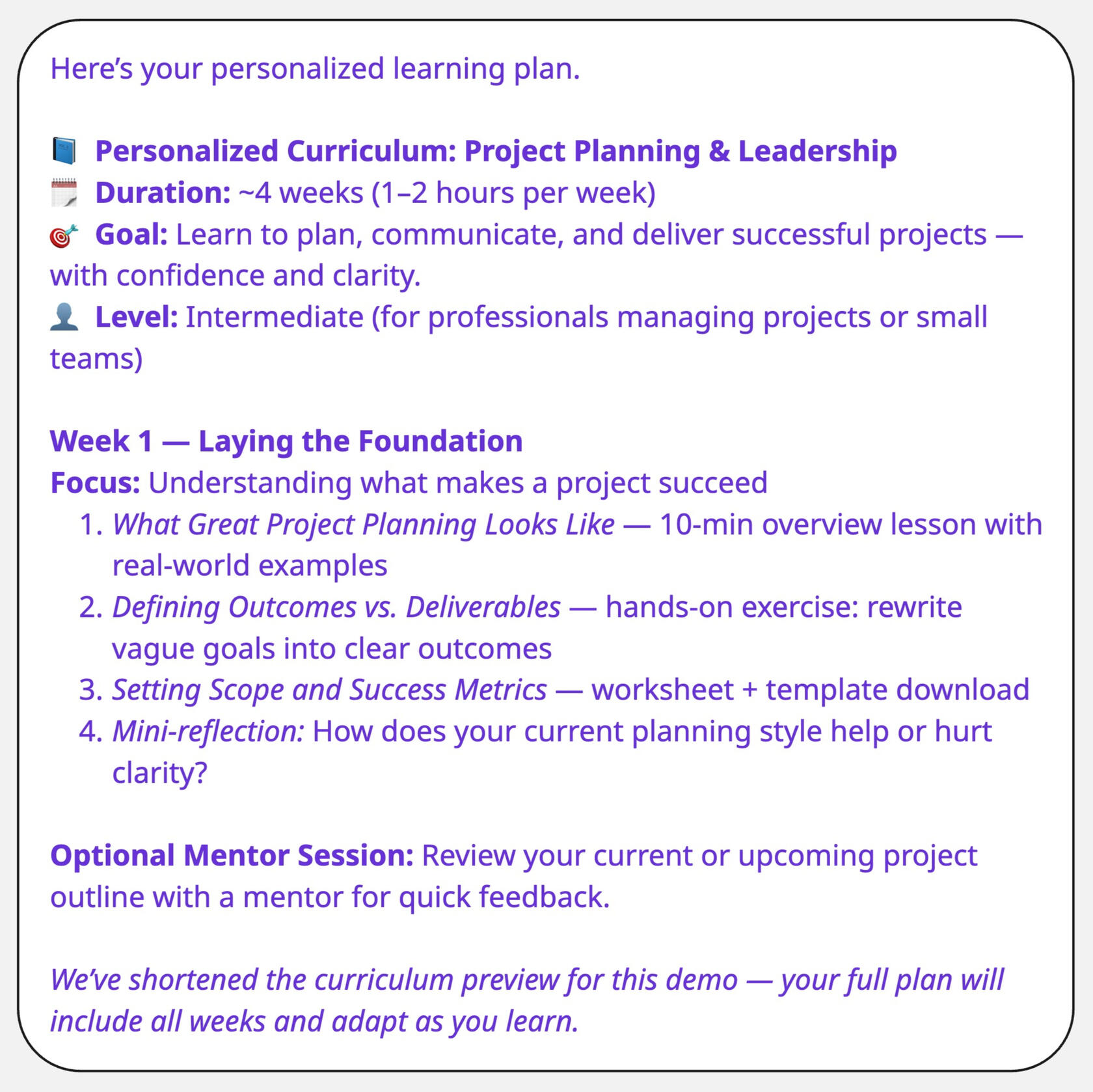 You’ll instantly get a structured learning plan — lessons, projects, and milestones designed around your goals.