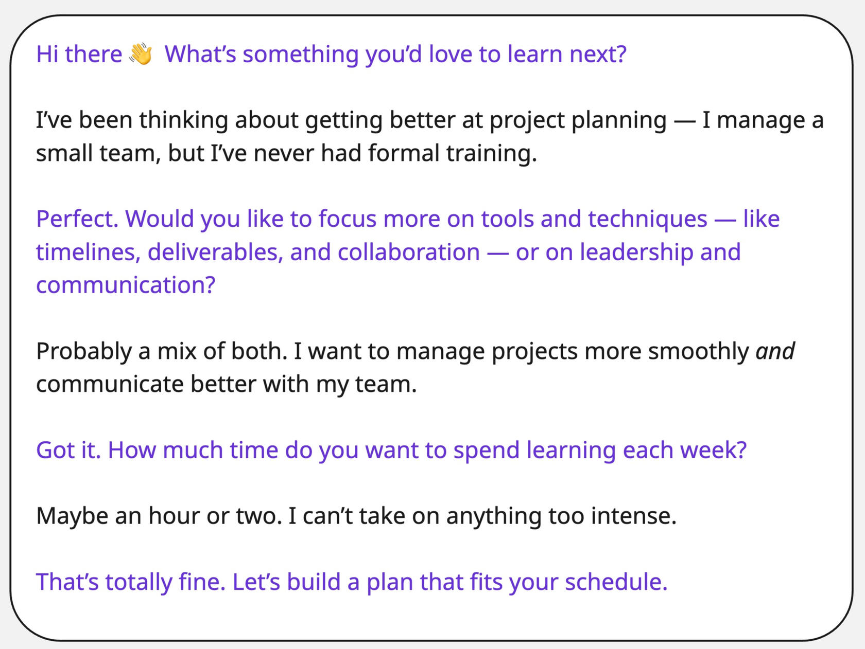 Start by sharing what you’d like to learn — whether it’s mastering a new skill, exploring a passion, or leveling up in your career.